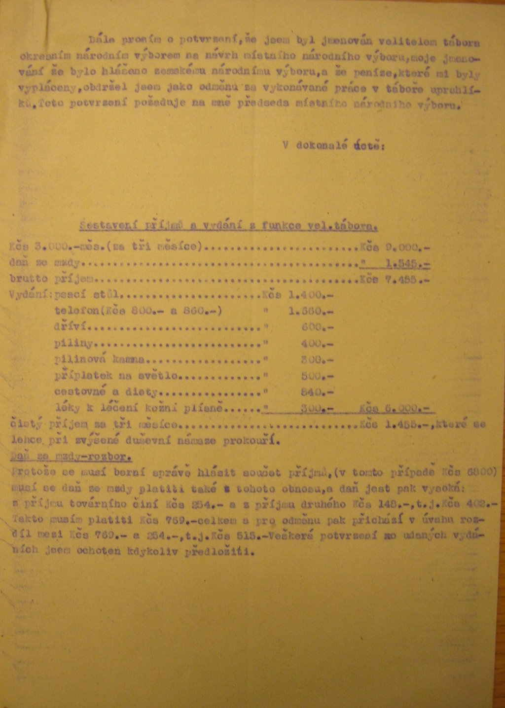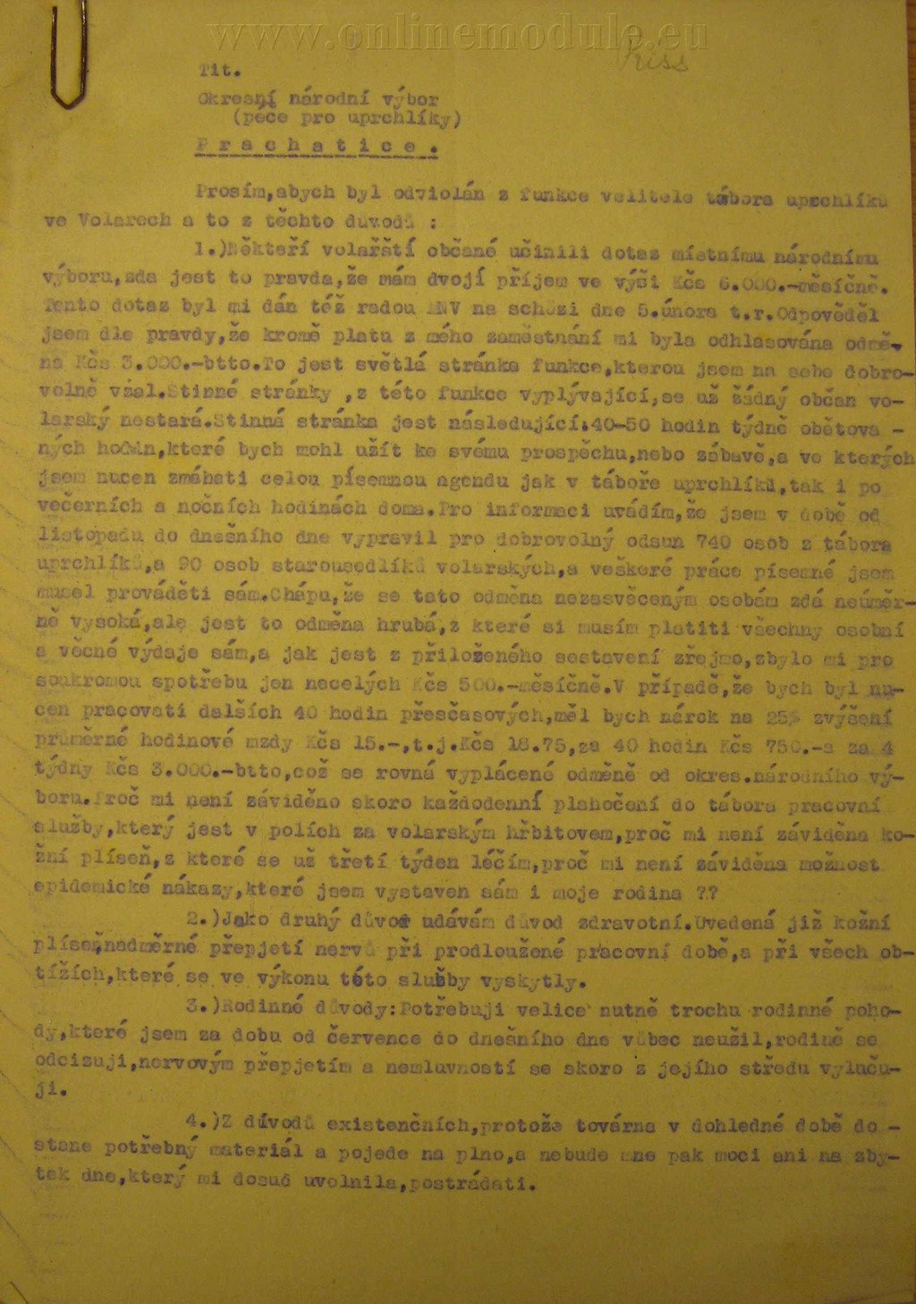 Velitelem sběrného tábora ve Volarech byl od 1.10.1945 Vojtěch Riss, který v květnu 1946 požádal o odvolání. V přiložené žádosti zmiňuje své důvody k tomuto kroku.