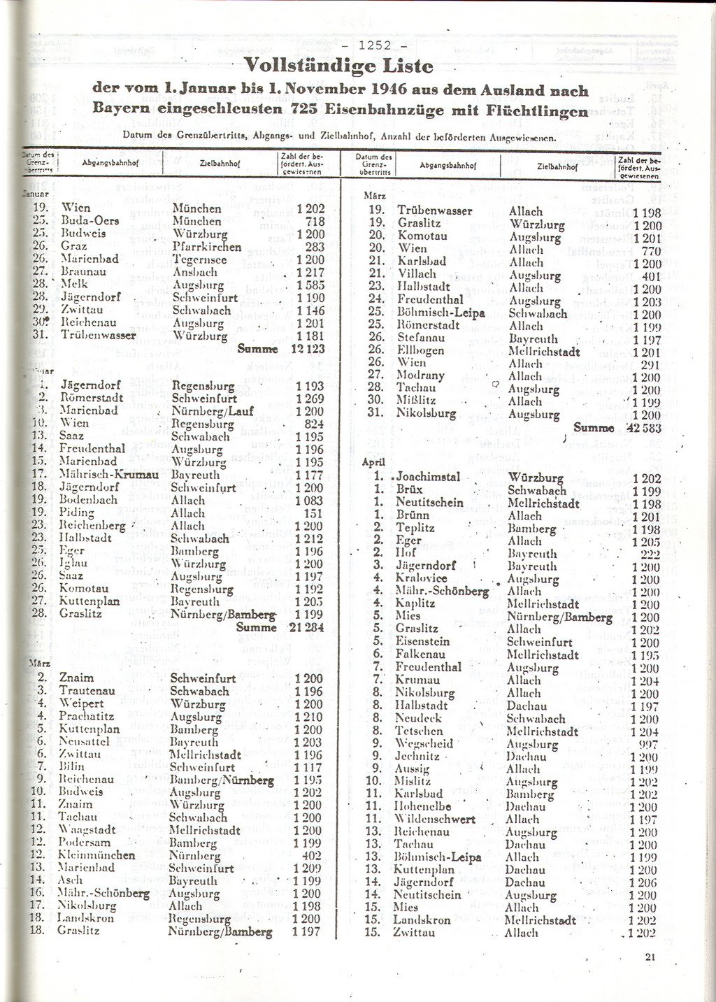 V seznamu je uveden datum překročení hranice, výchozí a cílová železniční stanice transportu a počet transportovaných osob.