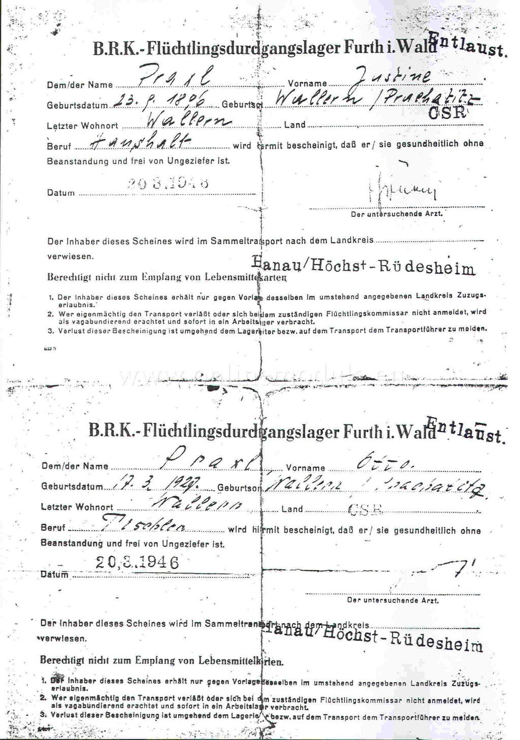 Dvě registrační karty z roku 1946 ozřejmují princip hromadných transportů do cílových okresů. Na kartách je kromě osobních údajů (jméno, zaměstnání, datum a místo narození) uvedeno i místo posledního bydliště a okres, do kterého má být dotyčná osoba vysídlena. Tyto konkrétní registrační karty patřily manželskému páru z Volar v okrese Prachatice, který byl vysídlen do okresu Hanau v Hesensku. Karta byla zároveň i povolenkou k usazení se ve zmíněném okrese.
