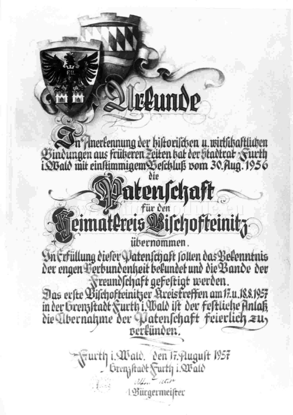 Dalším pramenem je listina, na základě které přebírá město Furth im Wald záštitu na sudetskými Němci z okresu Horšovský Týn. Záštitu převzal Furth im Wald v roce 1957, v roce 1973 zde bylo zřízeno vlastivědné muzeum Horšovského Týna. Ve Furthu se nachází řada pomníků, které připomínají nucené vysídlení. Žáci reálné školy ve Furthu vytvořili internetovou stránku s názvem "Stopy vysídlení ve Furth im Wald" s řadou dalších obrazových i písemných materiálů.