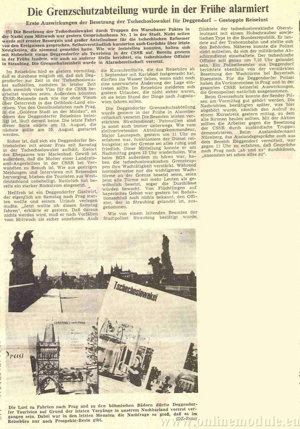 V cestovní kanceláři nám včera dopoledne sdělili, že je docela možné, že v Československu jsou někteří obyvatelé Deggendorfu, protože v poslední době bylo vydáno poměrně hodně víz pro ČSSR. Kromě toho mohou cestující stále jezdit do této východní země bez víza přes Rakousko. V současné době neprobíhá žádný z autobusových zájezdů do Prahy, do „zlatého města na Vltavě“, na kterých se cestovní kancelář v Deggendorfu podílí. Poslední zájezd z této řady skončil 13. srpna, další se měl konat 25. srpna.