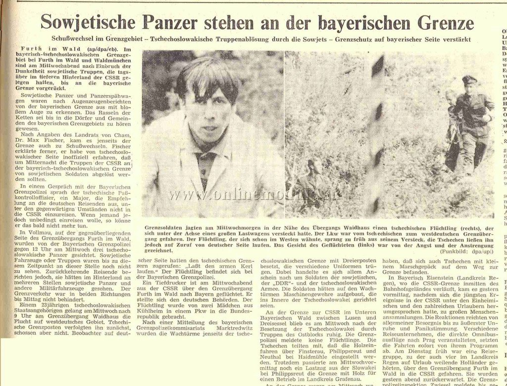 (fi) Koverzačním tématem číslo jedna byla včera ve městě okupace Československa vojsky států Varšavské smlouvy v noci na středu. Nezřídka se o událostech mluvilo s vážnými obavami a velkým zájmem o české reformy. Samozřejmě také kolovaly fámy o posledních novinkách, které nikdo nehlásil. Jak jsme zjistili, několik obyvatel Deggendorfu je s určitostí v ČSSR na dovolené. Jak už bylo zmíněno na jiném místě, už včera ráno přistál ve Straubingu český důstojník. Pohraniční jednotky byly uvedeny do pohotovostního stavu.