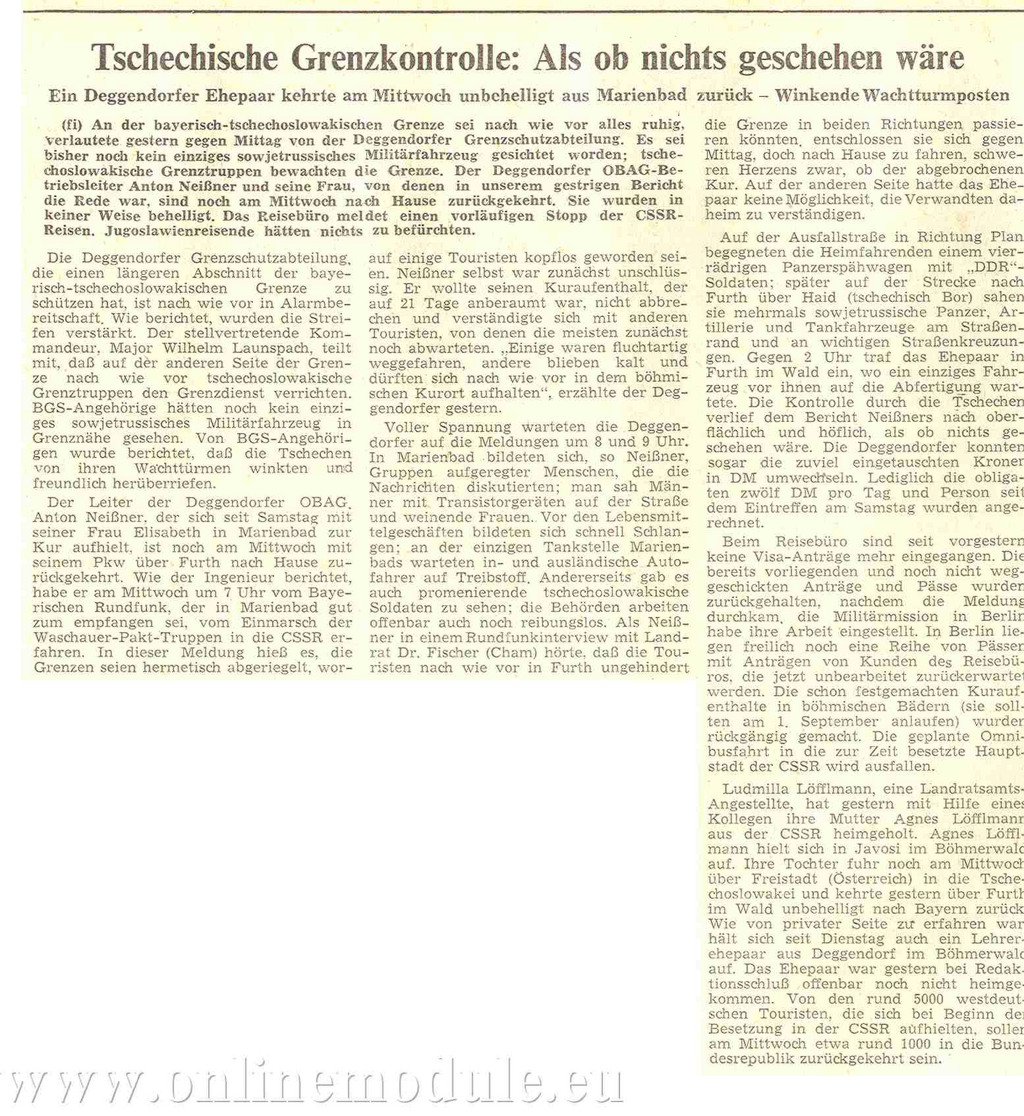 Ředitel deggendorfského podniku OBAG Anton Neißner, který se od soboty zdržoval se svou manželkou na lázeňském pobytu v Mariánských Lázních, se ve středu vrátil se svým autem domů přes Furth im Wald. Inženýr Neißner vyprávěl, že se o vpádu vojsk Varšavské smlouvy do ČSSR dověděl ve středu v sedm hodin z Bavorského rozhlasu, který má v Mariánských Lázních dobrý signál. Ve zprávách prý říkali, že hranice jsou hermeticky uzavřené, z čehož se několik turistů značně vyděsilo. Sám Neißner byl zpočátku nerozhodný. Svůj lázeňský pobyt naplánovaný na 21 dní nechtěl přerušit a radil se s ostatními turisty, z nichž většina ještě vyčkávala. „Někteří odjeli úprkem, jiní zachovali chladnou hlavu a v lázních směli pobývat tak jako předtím“, vyprávěl včera tento obyvatel Deggendorfu.