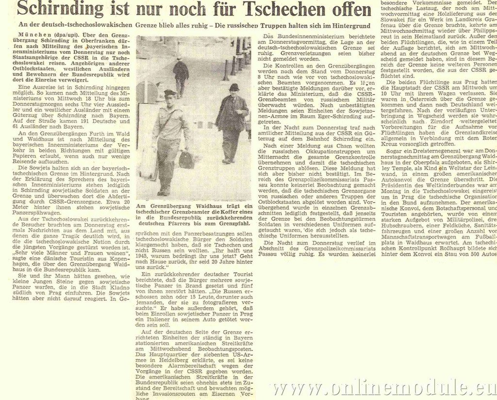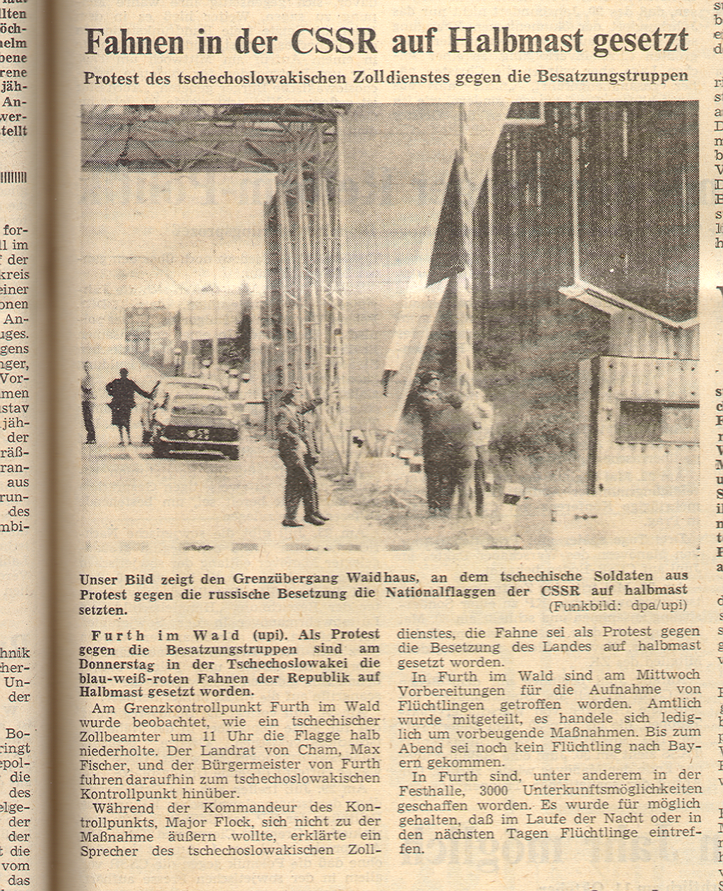 Oddělení pohraniční policie v Deggendorfu, které má za úkol chránit poměrně dlouhý úsek bavorsko-československé hranice, se stále nachází ve stavu pohotovosti. Jak už jsme informovali, byly zesíleny hlídky. Zastupující velitel major Wilhelm Launspach nám sdělil, že na druhé straně hranice vykonávají pohraniční službu stále československé jednotky. Příslušníci spolkové pohraniční stráže prý neviděli ještě ani jedno sovětskoruské vojenské vozidlo. Podle jejich slov jim Češi mávali ze strážních věží a přátelsky na ně pokřikovali.