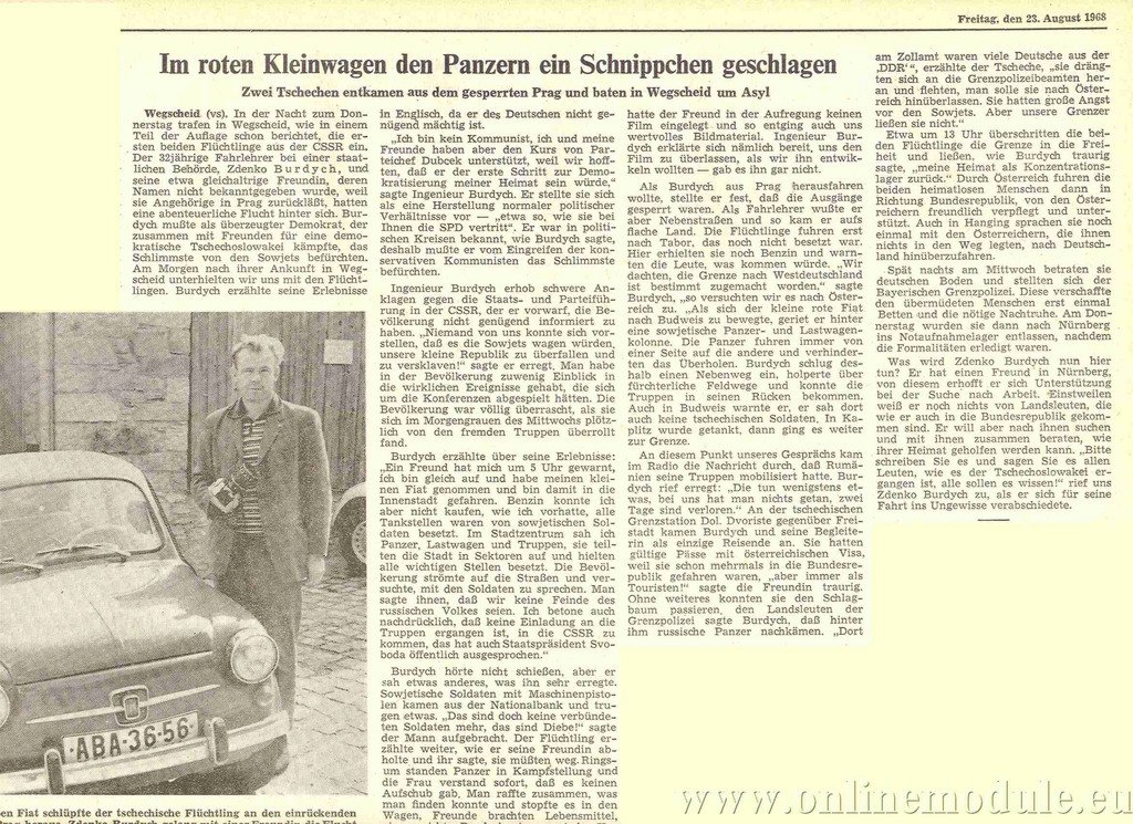 Wegscheid (vs). Jak už jsme informovali v jiné části tohoto vydání, dorazili v noci na čtvrtek do Wegscheidu první dva uprchlíci z ČSSR. Zdenko Burdych, 32letý učitel autoškoly při jednom státním úřadu, a jeho přibližně stejně stará manželka, jejíž jméno nebylo zveřejněno, protože má v Praze příbuzné, za sebou mají dobrodružný útěk. Jako přesvědčený demokrat, který společně s přáteli bojoval za demokratické Československo, se musel Burdych od Sovětů obávat nejhoršího. Ráno po jejich příjezdu jsme se bavili s oběma uprchlíky. Burdych vyprávěl o svých zážitcích v angličtině, protože němčinu ještě dostatečně neovládá.