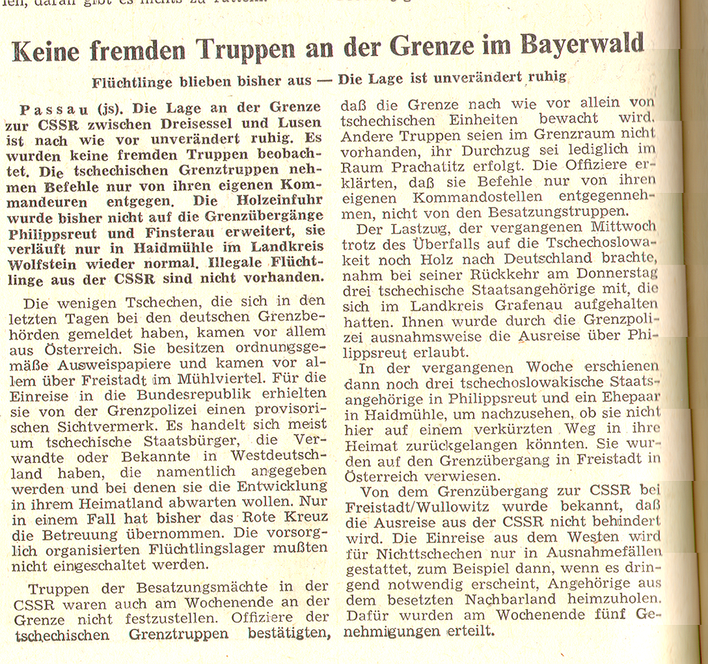 Vojska okupačních mocností v ČSSR se o víkendu na hranici neobjevila. Velitelé českých skupin potvrdili, že hranice je i nadále střežena pouze českými jednotkami. Jiná vojska se v pohraničním pásmu nenacházejí, jejich průjezd se omezil na Prachaticko. Velitelé prohlásili, že přijímají rozkazy pouze od vlastních velitelství, nikoli od okupačních vojsk.