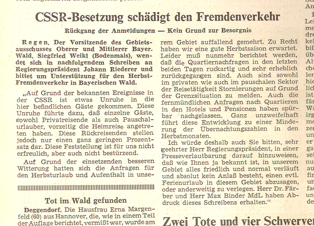 REGEN. Předseda oblastního výboru pro Horní a Střední Bavorský les, Siegfried Weikl (Bodenmais), se obrací následujícím dopisem na předsedu vlády Johanna Riederera a prosí o podporu turistického ruchu v Bavorském lese v podzimní sezóně.