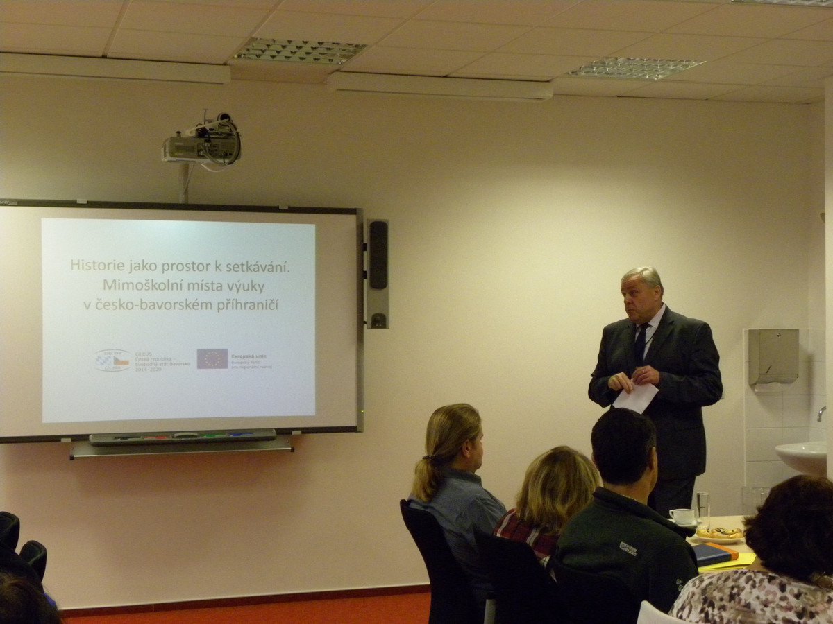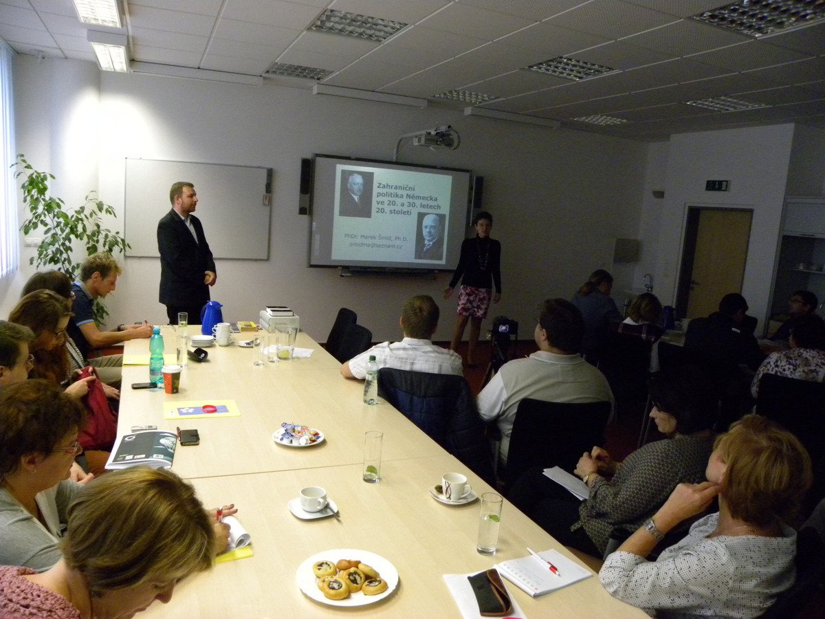 Přivítání se ujal Prof. PhDr. Václav Bůžek, ředitel Historického ústavu FF JU. Jako hlavního přednášejícího hosta se nám podařilo získat plukovníka PhDr. Eduarda Stehlíka, který hovořil na téma Československý val jako pohraniční opevnění mezi Bavorskem a Čechami. O zahraniční politice Německa ve 20. a 30. letech 20. století přednášel PhDr. Marek Šmíd, Ph.D. Zároveň byli účastníci seznámeni s nabídkou našeho projektu a s možnostmi spolupráce na evaluaci výukových materiálů.
