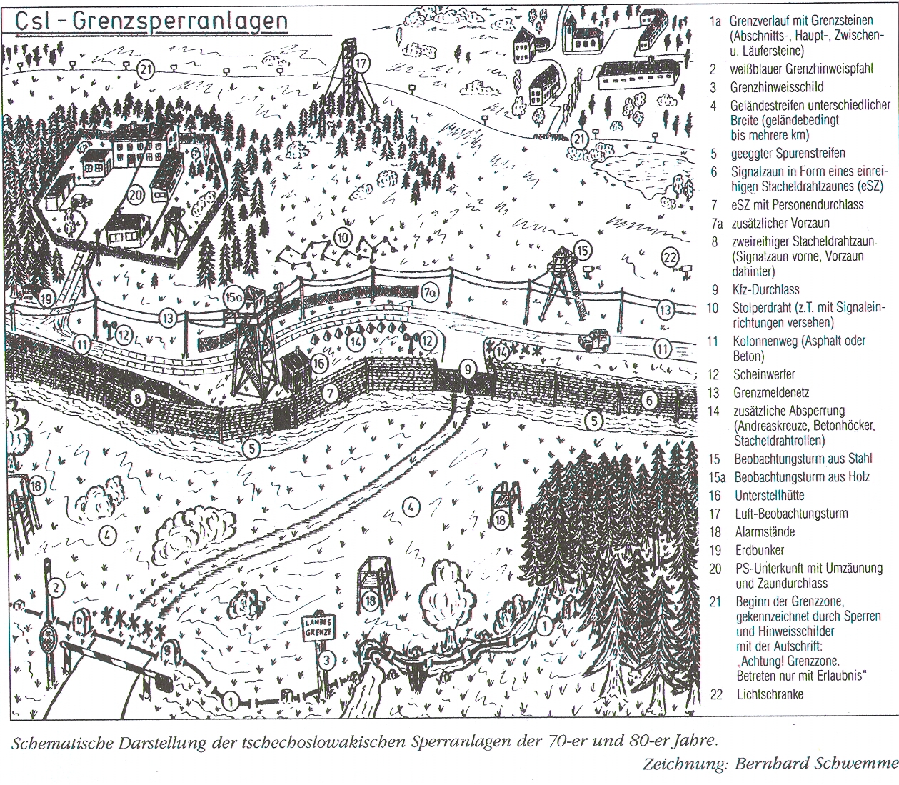„Die aufwendige, jedoch im Vergleich zur DDR-Grenze verhältnismäßig „human“ gesicherte Grenze erscheint dem unkundigen Betrachter das Bild einer offenen Grenze, weil die tschechoslowakischen Grenzwachen (PS = Pohraniční stráž) die Sperranlagen unmittelbar an der Grenze abbauten und in das Hinterland verlegten.“