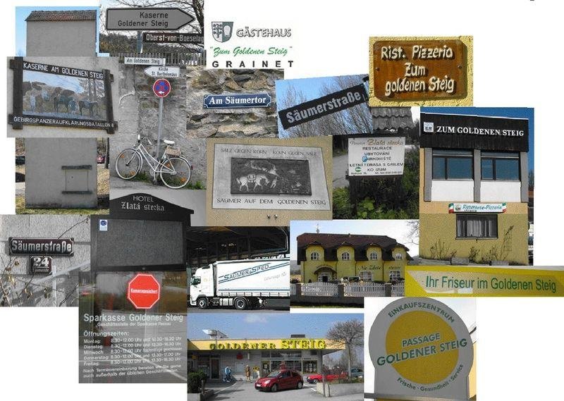 Alle diese Fotos zeigen wie allgegenwärtig die Begriffe Goldener Steig und Zlatá stezka im Straßenbild der Region sind. Sie wurden 2007 in Prachatitz, Freyung und Passau aufgenommen. Die Fotokollage kann zum Einstieg in das Thema "Goldener Steig" genutzt werden.