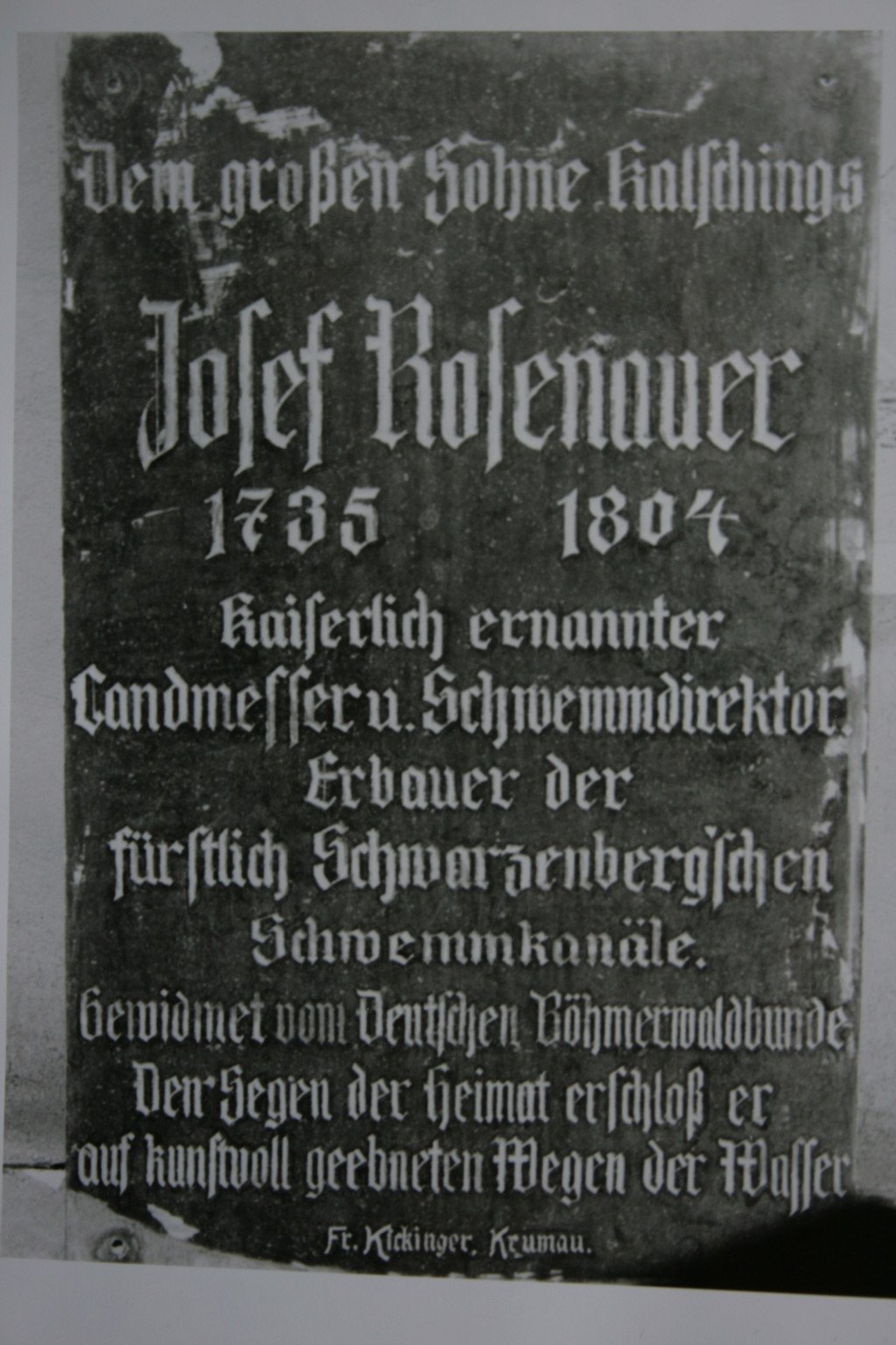 Josef Rosenauer (*1735 in Kalsching/Chvalšiny bei Krumau) kehrt vom Studium an der Ingenieurakademie in Wien, wohin er von Fürsten Schwarzenberg geschickt wurde, zurück und wird zum fürstlichen Ingenieur ernannt